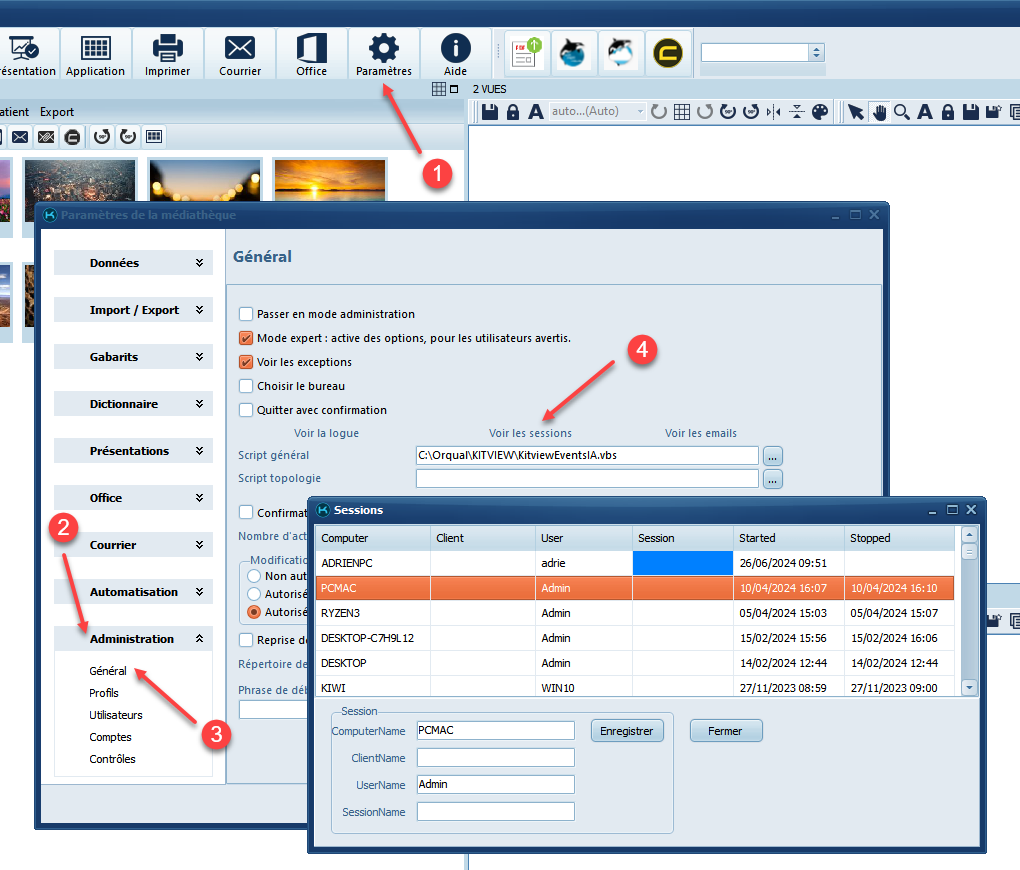 Si plusieurs postes ont le même nom dans Kitview mobile : Dans Kitview mobile, le nom d’un poste affiché correspond (Dans cet ordre) soit au nom de la session Session (si renseigné) soit au nom du client Client (si renseigné) soit au nom de l’ordinateur Computer. (si renseigné)