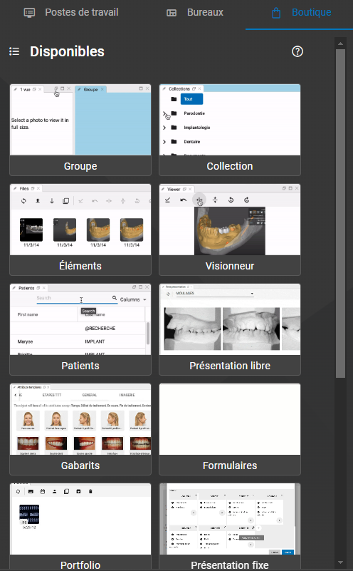 Éléments : les éléments sont les objets stockés dans la base de données d’un patient. Photos, vidéos, DOC, XLS, PPT, PDF, STL (3D) et n’importe quel fichier pourra y être stocké.