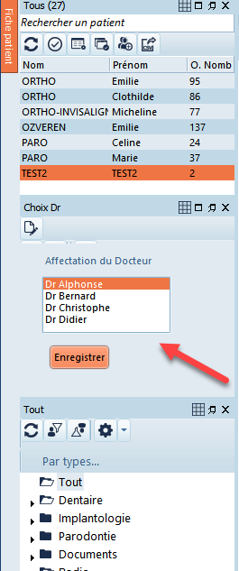 Pour chaque patient, commencez par sélectionner le nom du médecin approprié dans le formulaire "Choix Dr". Confirmez ensuite votre sélection en cliquant sur le bouton "Enregistrer".