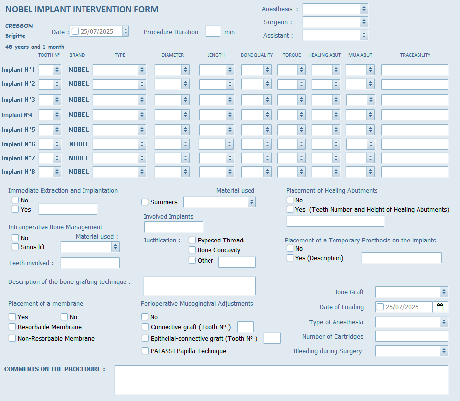 IMP-0004 - NOBEL IMPLANT INTERVENTION FORM Adrien GIRAUD 2 octobre 2025 10:11 Mise à jour Download KDR Associé à windows Articles associés COMPLETE DIAGNOSTICS ORT-0014-DIAGNOSTIC ASSESSMENT IMP-0007-POST OPERATIVE REPORT Commentaires 0 commentaire Vous devez vous connecter pour laisser un commentaire.