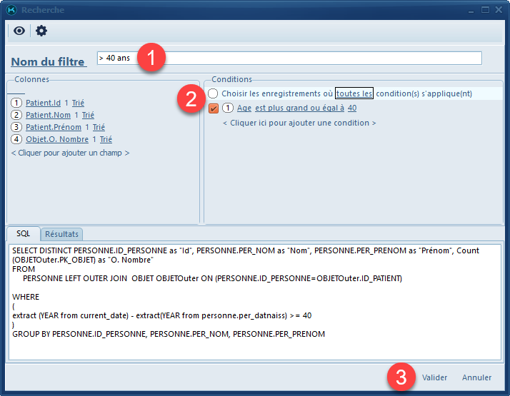 Vous permet de modifier le votre filtre de populations en ajoutant des conditions tel que l'âge, une date d'objet, ou un numéro de téléphone par exemple. Vous pourrez aussi supprimer une condition sélectionnée.